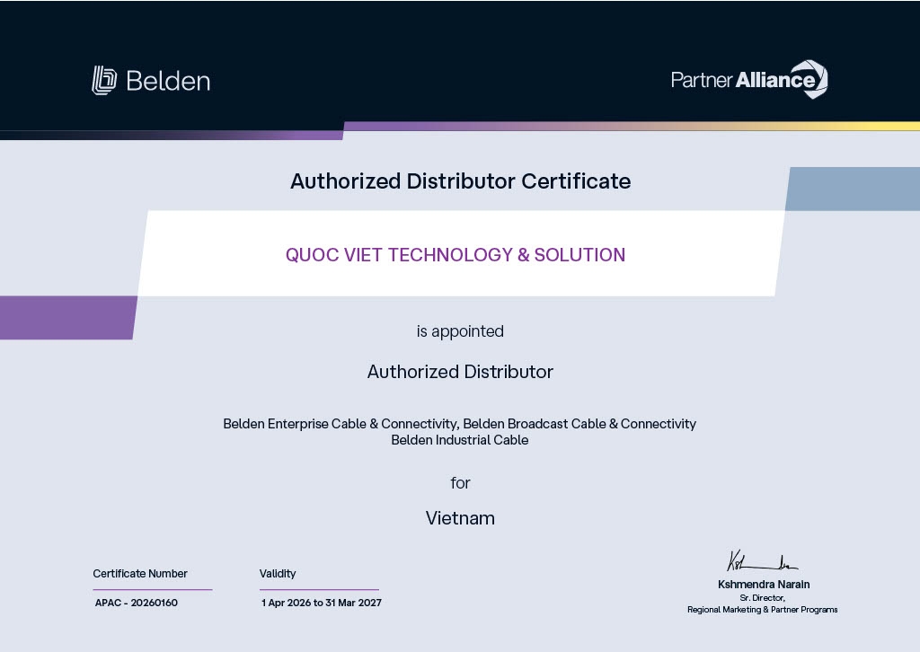 Tin tứcTrang chủ Tin tứcGiấy chứng nhận NPP BeldenGiấy chứng nhận NPP Belden Tin mới nhất ISO 9001:2015Công ty TNHH Giải pháp và Kỹ thuật Quốc Việt đạt chứng chỉ ISO 9001:2015, được thành lập năm 2002, chuyên phân phối các loại dây dẫn, cáp tín hiệu, bao gồm cả những phụ kiện cáp liên quan Giấy chứng nhận NPP AlantekNhà sản xuất cáp Alantek cam kết hỗ trợ tốt nhất cho thị trường Việt Nam thông qua nhà Phân phối chính thức là công ty TNHH Giải pháp và Kỹ Thuật Quốc Việt. Giấy Chứng Nhận NPP Hydroball